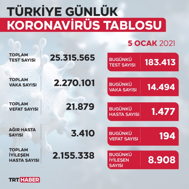 Türkiye'de son 24 saatte 183 bin 413 COVID-19 testi yapıldı, 14 bin 494 kişinin testi pozitif çıktı.