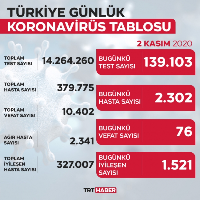 Toplam test sayısı 14 milyon 264 bin 260'a ulaştı. Hasta sayısı 379 bin 775, vefat sayısı 10 bin 402, ağır hasta sayısı 2 bin 341, aktif hasta sayısı 42 bin 366 oldu.