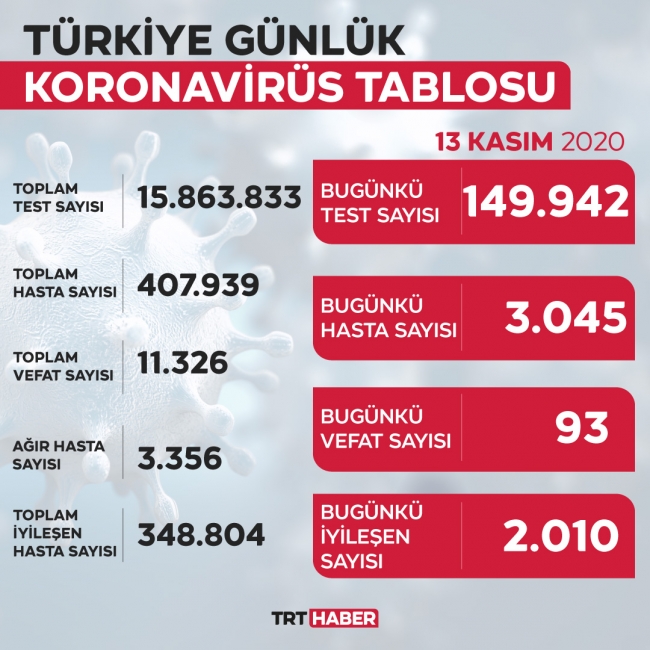 Toplam test sayısı 15 milyon 863 bin 833'e ulaştı. Hasta sayısı 407 bin 939, vefat sayısı 11 bin 326, ağır hasta sayısı 3 bin 356, aktif hasta sayısı 47 bin 809 oldu.