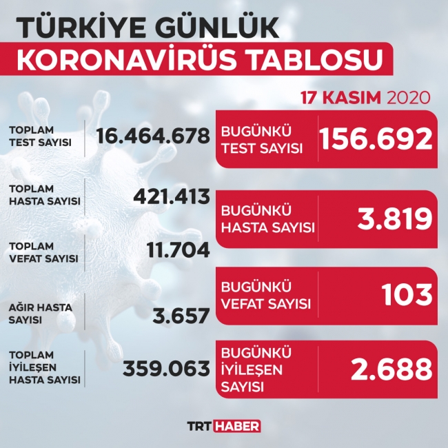 Toplam test sayısı 16 milyon 464 bin 678'ya ulaştı. Hasta sayısı 421 bin 413, vefat sayısı 11 bin 704, ağır hasta sayısı 3 bin 657, aktif hasta sayısı 50 bin 646 oldu.