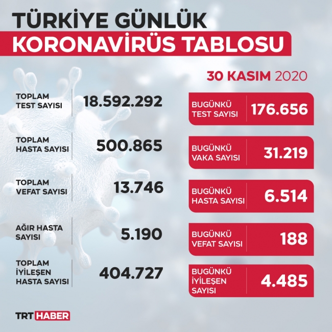 Son 24 saatte, 188 kişi hayatını kaybetti, 4 bin 485 kişinin COVID-19 tedavisinin tamamlanmasıyla iyileşenlerin sayısı 404 bin 727'ye yükseldi.