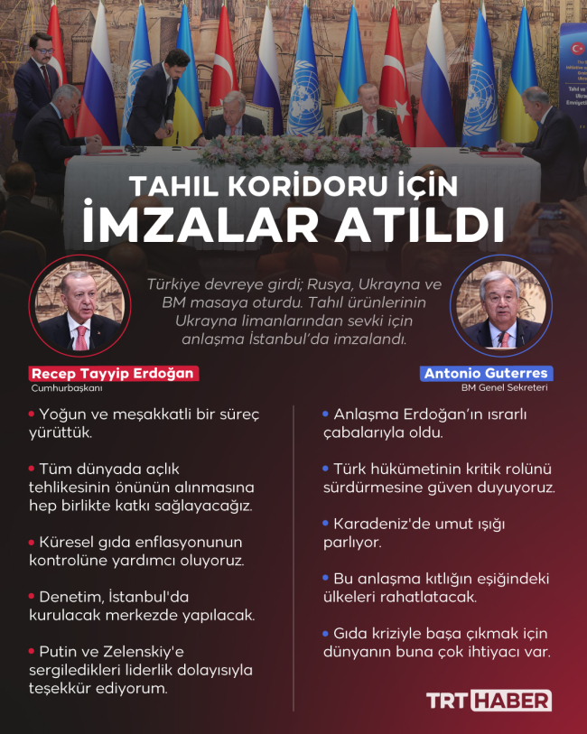 Cumhurbaşkanı Recep Tayyip Erdoğan'ın himayelerinde, Türkiye, Rusya, Ukrayna ve Birleşmiş Milletler (BM) arasında "Tahıl ve Yiyecek Maddelerinin Ukrayna Limanlarından Emniyetli Sevki Girişimi Belgesi" imzalandı.