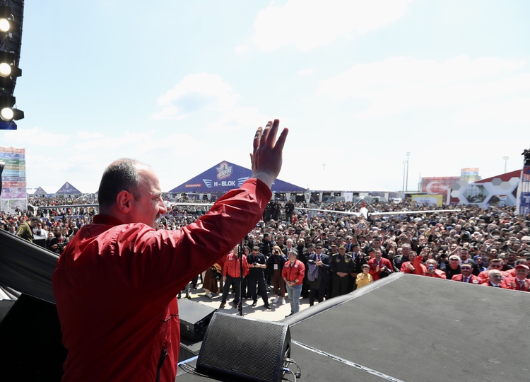 "Sizler de şahit oldunuz. Ne dediler, 'dokunacaklarmış.' Bir kez de buradan söyleyeyim; dokunacağız dedikleri tüm milli platformlarımıza sadece sizler, aziz milletimizin evlatları ve mazlumun yedi iklim dört kucaktaki dostları ancak dokunabilir. Bu uçaklara yalnızca tam bağımsız Türkiye hayaliyle yanıp tutuşan o güzel çocuklar gelip dokunabilir. O güzel çocuklar ki uçan kanatlarla ülkemizi, semaların da ötesine taşıyacaklar.