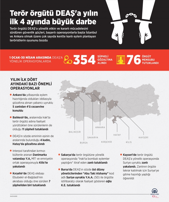 Bu kapsamda, ocak-nisan döneminde polis, jandarma ve hudut birliklerinin yürüttüğü çalışmalarda, aralarında terör örgütü DEAŞ'ın sözde üst düzey yöneticisi yabancıların da bulunduğu 354 şüpheli gözaltına alındı, örgüte ait çok sayıda doküman, silah ve mühimmat ele geçirildi.