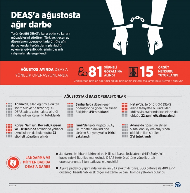 Güvenlik güçleri, geçen ay başta İzmir, Adana, Şanlıurfa, Hatay, Konya, Samsun, Kilis, Kayseri ve Kocaeli olmak üzere farklı kentlerde şafak vakti eş zamanlı düzenledikleri başarılı operasyonlarla örgüte nefes aldırmadı.