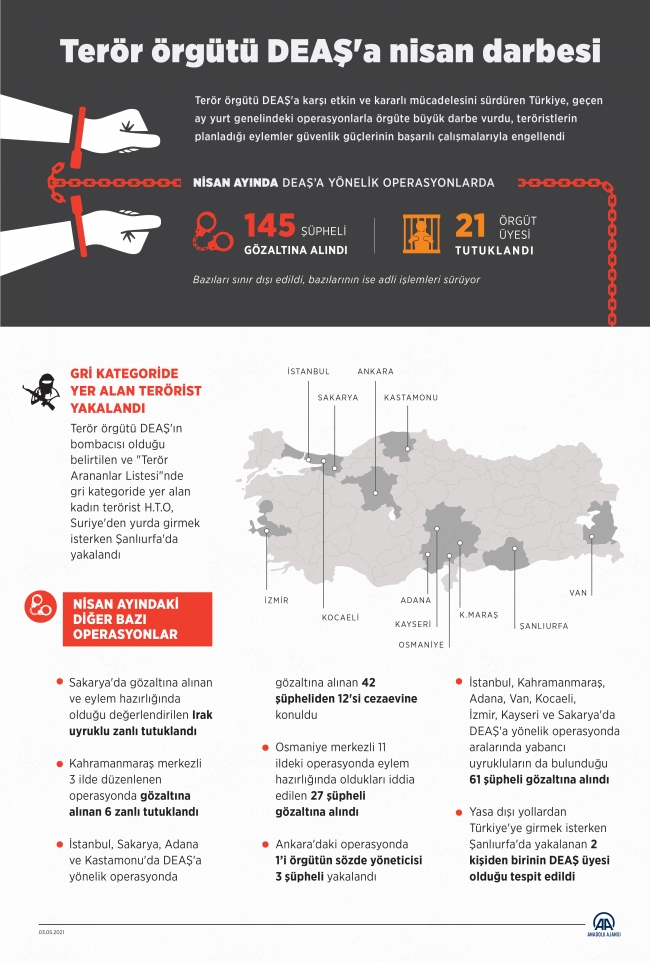 Nisan ayında polis, jandarma ve hudut birliklerinin DEAŞ'a yönelik çalışmalarında aralarında yabancı uyrukluların da bulunduğu 145 şüpheli gözaltına alındı, örgüte ait çok sayıda doküman, silah ve mühimmat ele geçirildi.