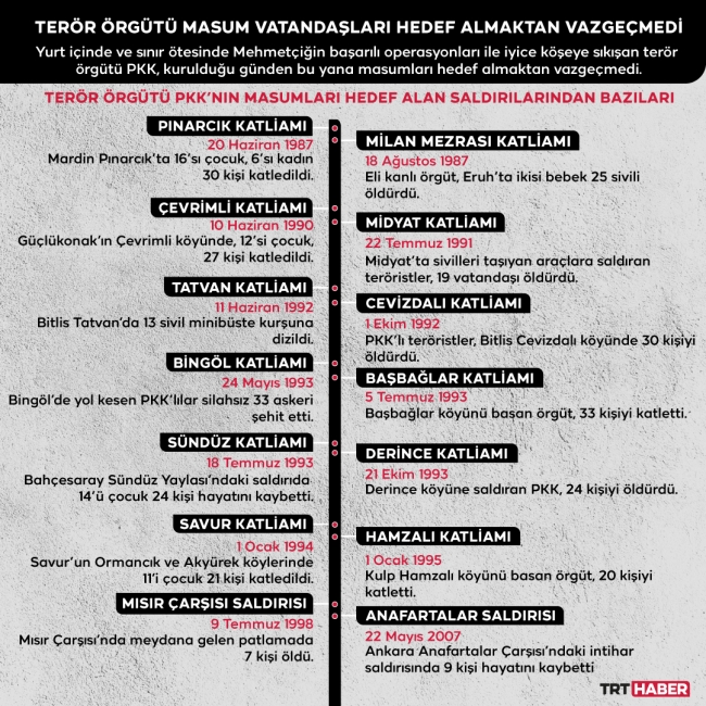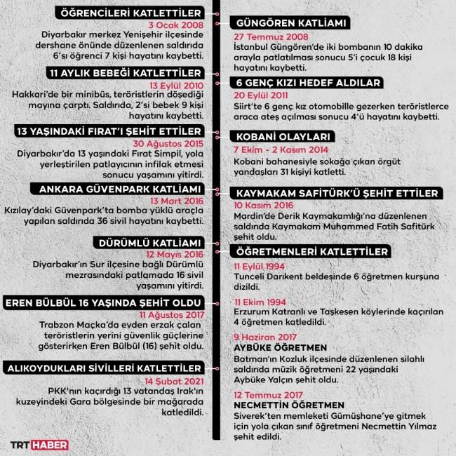 PKK, o günden bu yana çocuk, genç, yaşlı demeden binlerce masum insanı hedef alarak hafızalardan silinmeyen katliamlar yaptı.