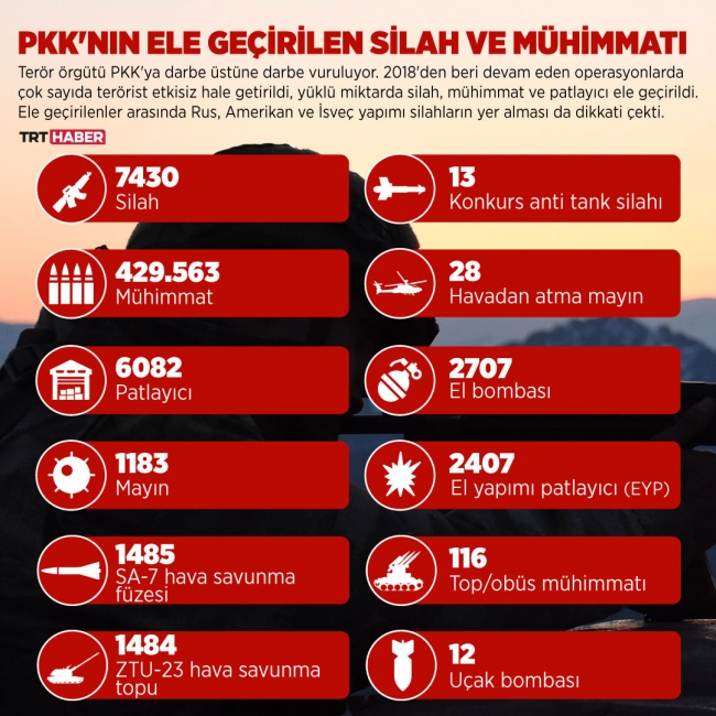 2018'den bu yana yapılan operasyonlarda 7 binden fazla silah bulundu. 430 bine yakın mühimmat, 6 binden fazla patlayıcı ile binin üzerinde mayın ele geçirildi.