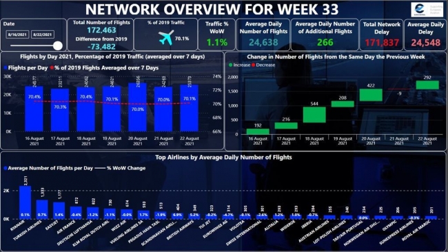 Avrupa Hava Seyrüsefer Emniyeti Teşkilatı'nın (EUROCONTROL), 16 ile 22 Ağustos tarihleri arasındaki hava trafiği verilerine göre, Avrupa hava yolu trafiğindeki yükseliş devam ediyor. Söz konusu tarihlerde Avrupa'da 172 bin 463 uçuş gerçekleştirildi.
