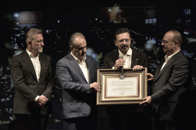 Konuşmaların ardından Bursa Valisi Yakup Canbolat, Büyükşehir Belediye Başkanı Alinur Aktaş, Bursa Ticaret ve Sanayi Odası (BTSO) Yönetim Kurulu Başkanı İbrahim Burkay ve Bursa Ticaret Borsası (BTB) Yönetim Kurulu Başkanı Özer Matlı, Hisarcıklıoğlu'na Bursa Şehri Hizmet Nişanı belgesini takdim etti.