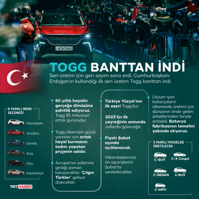 Cumhurbaşkanı Erdoğan tarafından 27 Aralık 2019'da ön gösterim araçlarının tanıtımı yapılan, 18 Temmuz 2020'de fabrikasının inşasına başlanan Togg'un seri üretimi için geri sayım sona erdi.