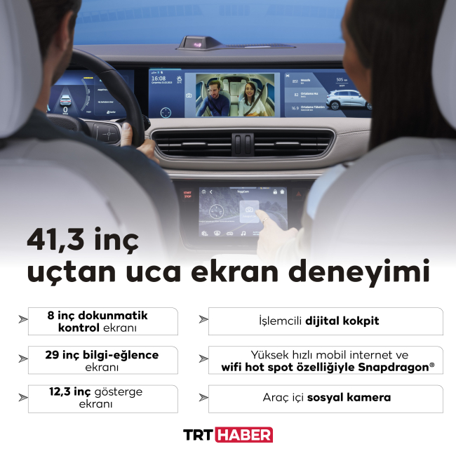 12,3 inç gösterge ekranı ve 29 inç bilgi-eğlence ekranından oluşan 41,3 inç uçtan uca ekran deneyimi, 8 inç dokunmatik kontrol ekranı, araç içi sosyal kamera, yüksek hızlı mobil internet ve wifi hot spot özelliğiyle Snapdragon® işlemcili dijital kokpit, T10X’de standart olarak sunuluyor.