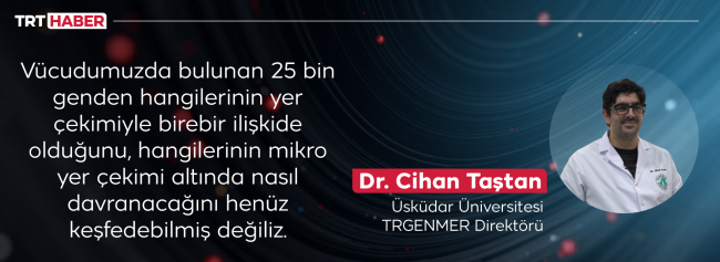 Dr. Taştan, “İnsanoğlu yüzyıllardır dünyanın yer çekimi altında hapsolmuş bir şekilde yaşıyor. Dolayısıyla vücudumuzdaki bütün hücreler yer çekimine bağlı olarak hayatını sürdürmek zorunda. Ancak son yıllarda insanların hayali olan uzay seyahatleri, hatta hayatın tümünü uzayda geçirebilmek, vücudumuz için elverişli olmayabilir. Çünkü vücudumuzda bulunan 25 bin genden hangilerinin yer çekimiyle birebir ilişkide olduğunu, hangilerinin mikro yer çekimi altında nasıl davranacağını henüz keşfedebilmiş değiliz” diyor.