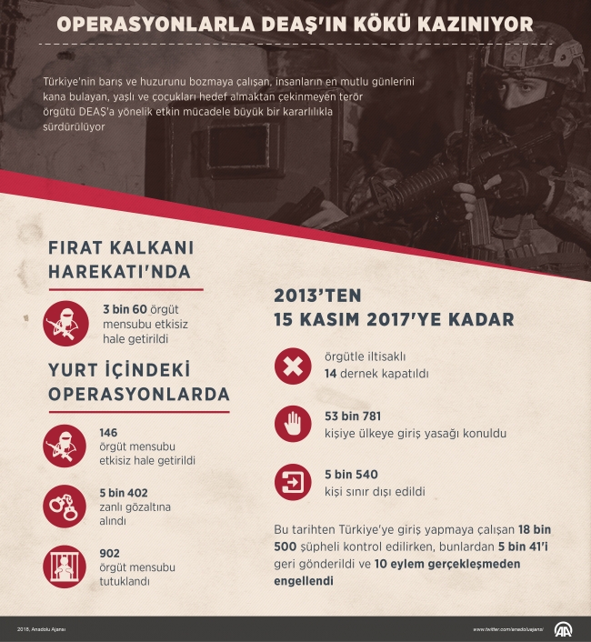 Öte yandan, DEAŞ ile mücadele kapsamında 15 Kasım 2017'ye kadar örgütle iltisaklı 14 dernek kapatıldı, 53 bin 781 kişiye ülkeye giriş yasağı konuldu ve 5 bin 540 kişi bu kapsamda sınır dışı edildi. Bu tarihten sonra DEAŞ'a karşı yurt içinde düzenlenen 838 operasyonda 146 terörist etkisiz hale getirildi. Türkiye'ye giriş yapmaya çalışan 18 bin 500 zanlı, risk analiz birimlerinin çalışması sonucunda kontrol edilirken, bunlardan 5 bin 41'i geri gönderildi ve 10 eylem gerçekleşmeden engellendi.