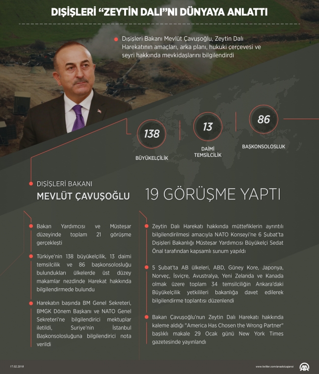 Diplomatik kaynaklardan alınan bilgiye göre, Çavuşoğlu, harekatın başladığı 20 Ocak'tan itibaren ilk 4 günde ABD'li mevkidaşı Rex Tillerson ve Fransa'nın Avrupa ve Dışişleri Bakanı Jean-Yves Le Drian ile hem telefonda hem de yüz yüze görüştü.