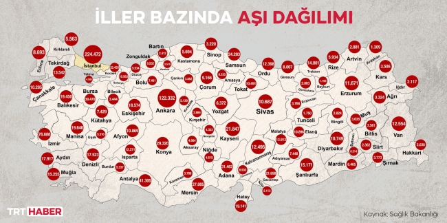 Sağlık Bakanı Fahrettin Koca, sosyal paylaşım sitesi Twitter üzerinden yaptığı paylaşımda, “1 milyon 200 binden fazla kişi şu ana kadar aşı oldu. Türkiye’de iller bazında aşı dağılımını görebilirsiniz. Pazartesi gününden itibaren bunu canlı olarak takip edebileceksiniz. En çok sağlık çalışanımızın bulunduğu İstanbul’da 224.000’den fazla kişi aşı oldu” ifadelerini kullandı. Bakan Koca ayrıca paylaşımına Türkiye’deki Covid-19 aşılama haritasını da ekledi.