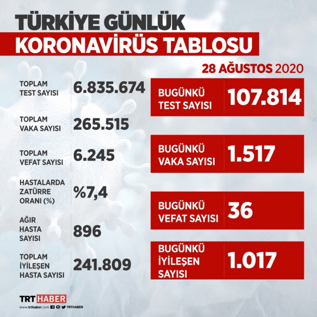 Türkiye'de son 24 saatte 1517 kişiye COVID-19 tanısı konuldu, 36 kişi hayatını kaybetti, toplam vaka sayısı 265 bin 515, can kaybı 6 bin 245 oldu.