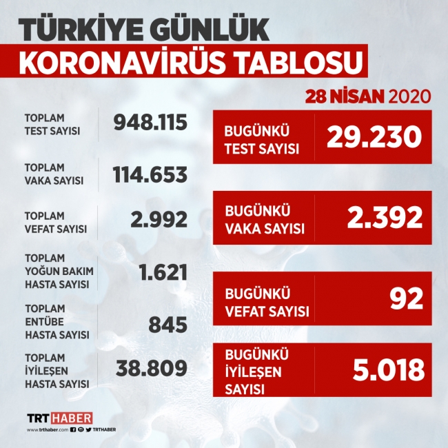 Toplam test sayısı 948 bin 115, toplam vaka sayısı 114 bin 653, toplam vefat sayısı 2 bin 992, toplam yoğun bakım hasta sayısı 1621, toplam entübe hasta sayısı 85, toplam iyileşen hasta sayısı 38 bin 809 oldu.