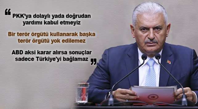 Türkiye'nin bu konudaki durumunun çok net olduğunu belirten Yıldırım, "Düşüncesinde herhangi bir kafa karışıklığı yoktur. Nedir? Türkiye bölgede PKK'nın bir başka terör örgütü DEAŞ'a karşı kullanılmasına karşıdır. Bunu net bir şekilde muhataplarımıza söyledik. Bir terör örgütü kullanarak başka terör örgütü yok edilemez. Sonra o terör örgütü de sizin başınıza bela olur. Bunu Amerika çok iyi şekilde bilmektedir." şeklinde konuştu.
