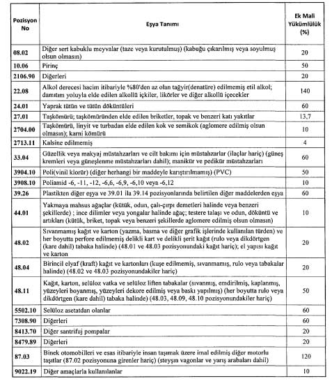 Diğer sert kabuklu meyveler (taze veya kurutulmuş, kabuğu çıkarılmış veya soyulmuş olsun olmasın) yüzde 20, pirinç yüzde 50, diğerleri yüzde 20, alkol derecesi hacim itibarıyla yüzde 80'den az olan tağyir (denatüre) edilmemiş etil alkol; damıtım yoluyla elde edilen alkollü içkiler, likörler ve diğer alkollü içecekler yüzde 140, yaprak tütün ve tütün döküntüleri yüzde 60, taş kömürü; taş kömüründen elde edilen briketler, topak ve benzeri katı yakıtlar yüzde 13,7, taş kömürü, linyit ve turbadan elde edilen kok ve semikok (aglomere edilmiş olsun olmasın); karni kömürü yüzde 10, kalsine edilmemiş yüzde 4, güzellik veya makyaj malzemeleri ve cilt bakımı için malzemeler (ilaçlar hariç, güneş kremleri veya güneşlenme malzemeleri dahil); manikür ve pedikür malzemeleri yüzde 60, poli (vinil klorür, diğer herhangi bir maddeyle karıştırılmamış, PVC) yüzde 50, poliamid -6, -11, -12, -6,6, -6,9, -6,10 veya -6,12 yüzde 10, plastikten diğer eşya ve 39.01 ila 39.14 pozisyonlarında belirtilen diğer maddelerden eşya yüzde 60, yakmaya mahsus ağaçlar (kütük, odun, çalı-çırpı demetleri halinde veya benzeri şekillerde); ince dilimler veya yongalar halinde ağaç; testere talaşı ve odun, döküntü ve artıkları (kütük, briket, topak veya benzeri şekillerde aglomere edilmiş olsun olmasın) yüzde 10, sıvanmamış kağıt ve karton (yazma, basma ve diğer grafik işlerinde kullanılan türden) ve her boyutta perfore edilmemiş delikli kart ve delikli şerit kağıt (rulo veya dikdörtgen -kare dahil- tabaka halinde), (48.01 ve 48.03 pozisyonundaki kağıt hariç); el yapısı kağıt ve karton yüzde 20, birincil elyaf (kraft) kağıt ve kartonları (kuşe edilmemiş, sıvanmamış, rulo veya tabaka halinde, 48.02 ve 48.03 pozisyonundakiler hariç) yüzde 20, kağıt, karton, selüloz vatka ve selüloz liften tabakalar (sıvanmış, emdirilmiş, kaplanmış, yüzeyleri boyanmış, yüzeyleri dekore edilmiş veya baskı yapılmış, her boyutta rulo veya dikdörtgen -kare dahil- tabaka halinde, 48.03, 48.09, 48.10 pozisyonundakiler hariç) yüzde 50, suni filament demetleri selüloz asetattan olanlar yüzde 60, diğerleri yüzde 60, diğer santrifüj pompalar yüzde 20, diğerleri yüzde 20, binek otomobilleri ve esas itibarıyla insan taşımak üzere imal edilmiş diğer motorlu taşıtlar (87.02 pozisyonuna girenler hariç, station vagonlar ve yarış arabaları dahil) yüzde 120, diğer amaçlarla kullanılanlar yüzde 10.