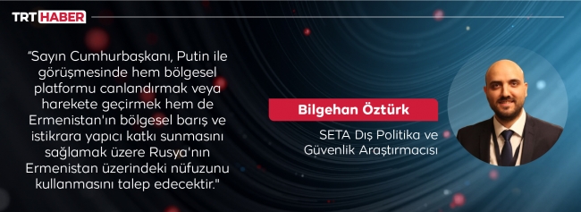 "Dağlık Karabağ'ın ötesinde Kafkasya'da barış ve istikrarın sürdürülebilir olması için bölgeye komşu ve her biri de bölgeyle sıkı bağları bulunan Türkiye, Rusya ve İran'ın da içinde olduğu bölgesel bir platform önerisi, Karabağ Savaşı'nın hemen ardından Türkiye tarafından teklif edilmiştir. Yerel ve bölgesel çatışmalarda, çatışma bölgesine komşu ve etkili aktörlerin inisiyatif alması ve çatışmaya bölgesel ölçekte çözüm bulması, öteden beri Türkiye'nin savunageldiği ‘bölgesel sahiplenme’ ilkesinin bir yansımasıdır. Bölgesel platformun yanı sıra, Türkiye'nin savaştan hemen sonra Ermenistan ile ilişkileri normalleştirme çağrısı da Ermenistan'ın gönüllü bir şekilde bu bölgedeki barış ve istikrara katkı sunmasını sağlamaya matuftur. Sayın Cumhurbaşkanı, Putin ile görüşmesinde hem bölgesel platformu canlandırmak veya harekete geçirmek hem de Ermenistan'ın bölgesel barış ve istikrara yapıcı katkı sunmasını sağlamak üzere Rusya'nın Ermenistan üzerindeki nüfuzunu kullanmasını talep edecektir."