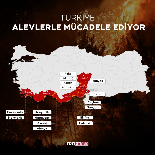 Türkiye’nin ‘ciğerleri’ yanıyor… Binlerce dönüm ormanlık alan alevlere teslim oldu. Adana, Antalya, Kayseri, Kütahya, Mersin, Muğla, Osmaniye olmak üzere 7 ilde 20 noktada yangın çıktı.