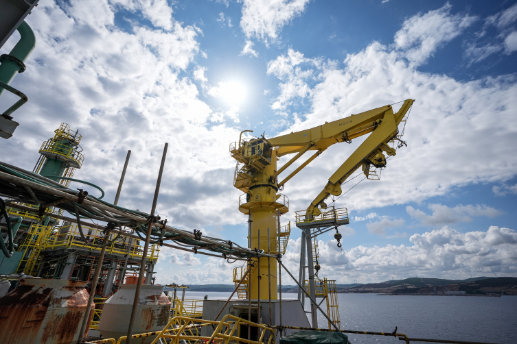 Çanakkale'nin Biga ilçesi Karabiga beldesindeki İÇDAŞ Limanı'ndan Çanakkale Valisi Ömer Toraman ve AK Parti Çanakkale Milletvekili Ayhan Gider ile gemiyle hareket eden Enerji ve Tabii Kaynaklar Bakanı Alparslan Bayraktar, Singapur'dan Türkiye'ye getirilen platformu karşıladı.