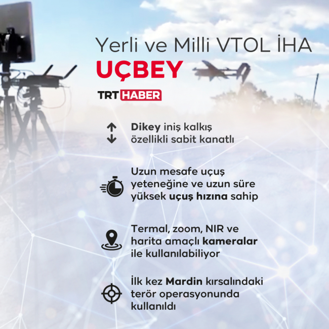 Emniyet Genel Müdürlüğü tarafından üretilen VTOL (dikey iniş kalkış yapabilen) İHA "UÇBEY" ilk saha görevini Mardin'de gerçekleştirdi.