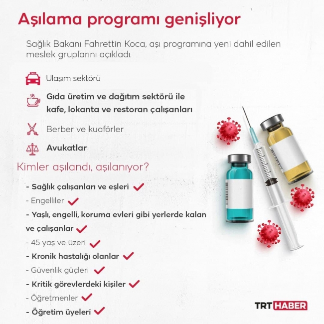 Bakan Koca, dün yaptığı paylaşımda, aşı programına gıda üretim ve dağıtım sektörü ile kafe, lokanta ve restoran çalışanlarının programa dahil edildiğini açıklamıştı.
