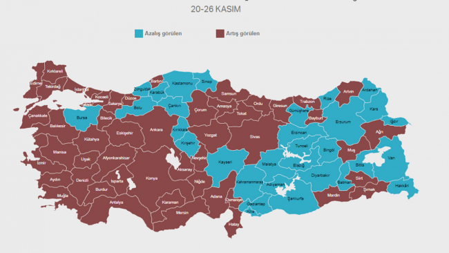 20-26 Kasım arasında vaka yoğunluğu bir önceki haftaya göre en çok artan 10 il şöyle: