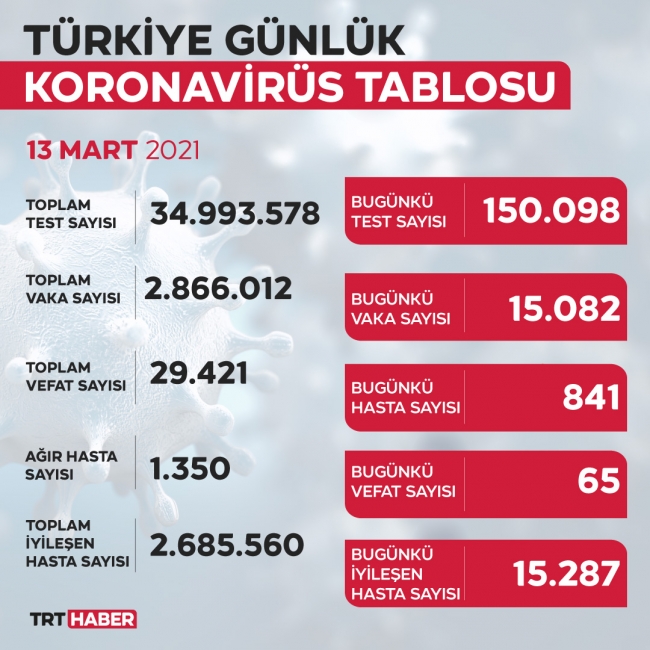 Test sayısı 34 milyon 993 bin 578'e ulaştı. Vaka sayısı 2 milyon 866 bin 12, vefat sayısı 29 bin 421, ağır hasta sayısı 1350 oldu.