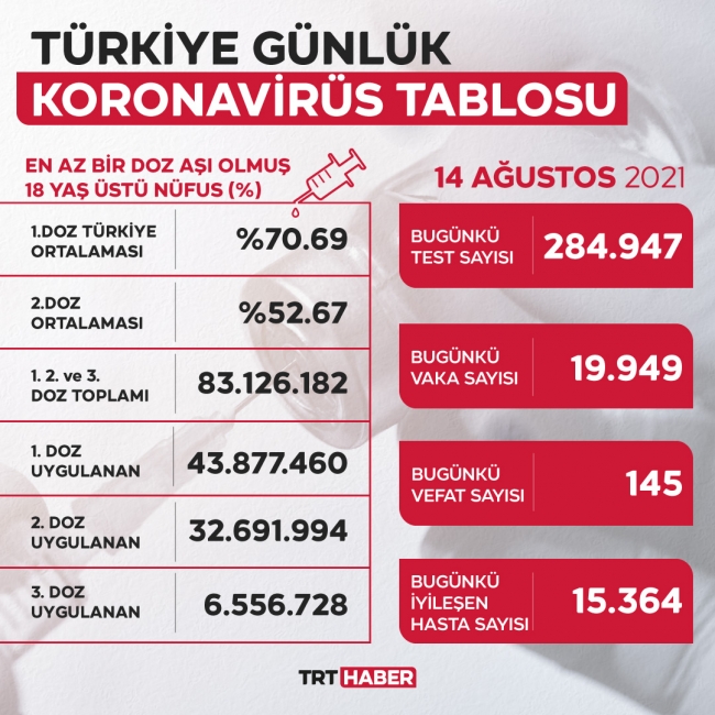 Buna göre, Türkiye'de son 24 saatte 284 bin 947 COVID-19 testi yapıldı, 19 bin 949 kişinin testi pozitif çıktı, 145 kişi hayatını kaybetti, iyileşenlerin sayısı ise 15 bin 364 oldu.
