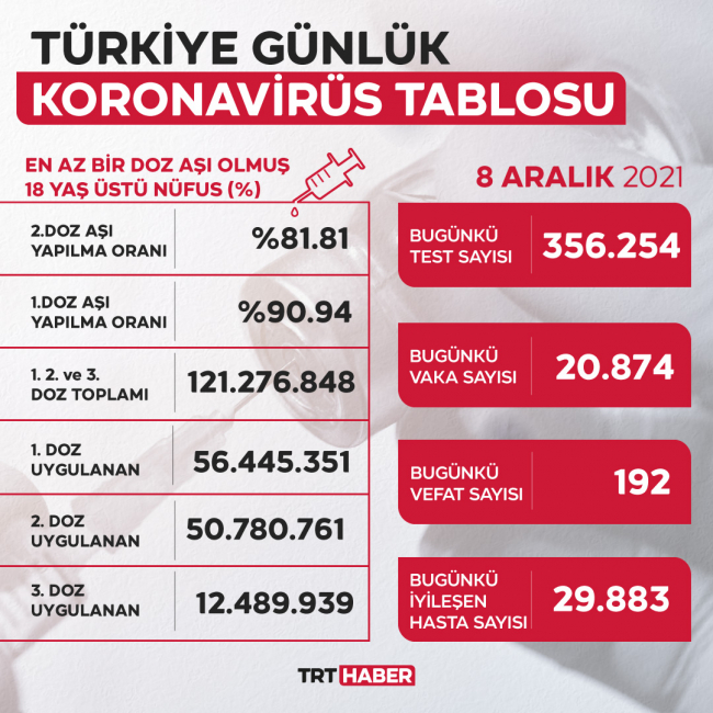 Türkiye'de bugüne kadar yapılan aşı saysı 56 milyon 445 bin 351'i birinci doz, 50 milyon 780 bin 761'i ikinci doz, 12 milyon 489 bin 939'u üçüncü doz olmak üzere 121 milyon 276 bin 848'e yükseldi.