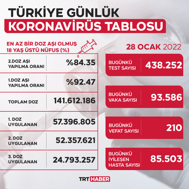 18 yaş ve üstü nüfusta ikinci doz aşı uygulananların oranı yüzde 84,35, birinci doz aşı yapılanların oranı yüzde 92,47 olarak kayıtlara geçti.