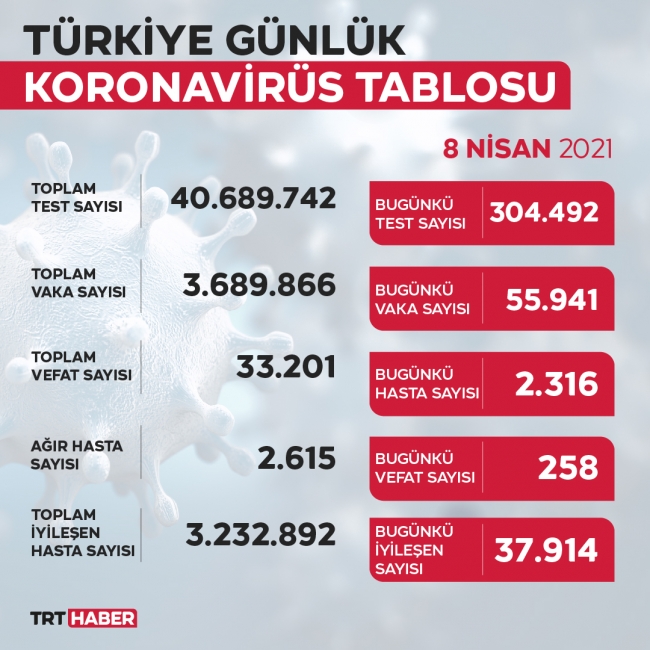 Toplam test sayısı 40 milyon 689 bin 742'ye ulaştı, vaka sayısı 3 milyon 689 bin 866, vefat sayısı 33 bin 201, ağır hasta sayısı 2 bin 615 oldu.