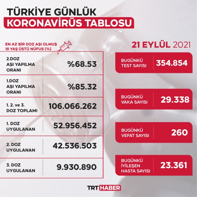 18 yaş üstü nüfusta birinci doz aşı uygulananların oranı yüzde 85,32, ikinci doz aşı uygulananların oranı yüzde 68,53 olarak kayda geçti.