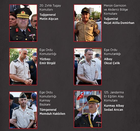 Hakkari Dağ ve Tugay Komutanı Tuğgeneral Ahmet Otal, Van Jandarma Asayiş Komutanlığı Askeri Mahkemesinde görevli 4 hakim ve savcı, Çaldıran İlçe Jandarma Komutanı Kandır ve İlçe Komando Bölük Komutanı Yıldırım gözaltına alındı.