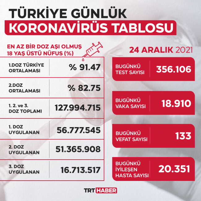 18 yaş üstü nüfusta birinci doz aşı uygulananların oranı yüzde 91,47, ikinci doz aşı uygulananların oranı yüzde 82,75 olarak kayda geçti.