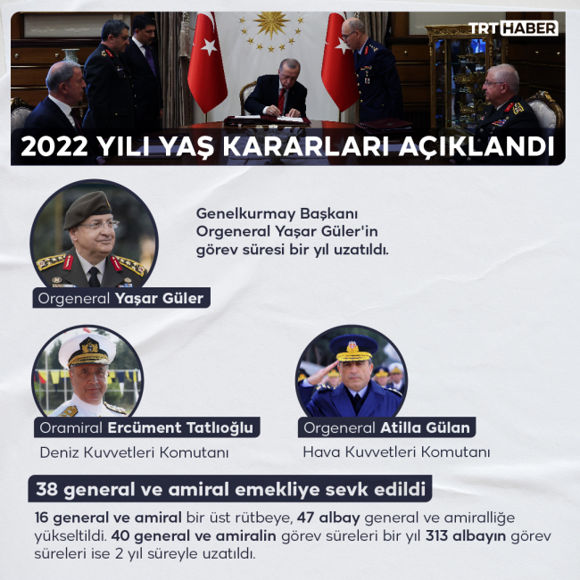 "30 Ağustos 2022 tarihinden geçerli olmak üzere 16 general ve amiral bir üst rütbeye, 47 albay general ve amiralliğe yükseltilmiştir. 40 general ve amiralin görev süreleri bir yıl, 313 albayın görev süreleri ise 2 yıl süreyle uzatılmıştır. 38 general ve amiral kadrosuzluk nedeniyle 30 Ağustos 2022 tarihinden geçerli olmak üzere emekliye sevk edilmiştir.