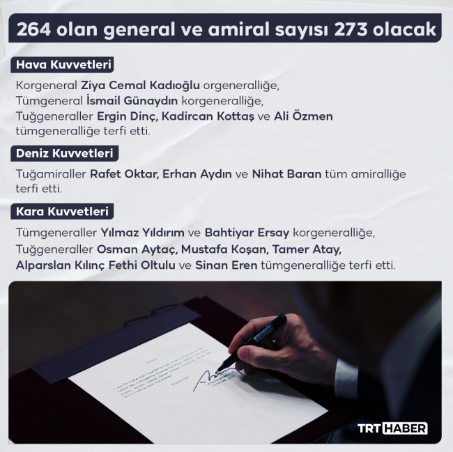 "30 Ağustos 2022 tarihinden geçerli olmak üzere Hava Kuvvetleri Komutanlığından Korgeneral Ziya Cemal Kadıoğlu orgeneralliğe, Kara Kuvvetleri Komutanlığından Tümgeneraller Yılmaz Yıldırım ve Bahtiyar Ersay korgeneralliğe, Hava Kuvvetleri Komutanlığından Tümgeneral İsmail Günaydın korgeneralliğe terfi ettirilmişlerdir. Kara Kuvvetleri Komutanlığından Tuğgeneraller Osman Aytaç, Mustafa Koşan, Tamer Atay, Alparslan Kılınç, Fethi Oltulu ve Sinan Eren tümgeneralliğe, Deniz Kuvvetleri Komutanlığından Tuğamiraller Rafet Oktar, Erhan Aydın ve Nihat Baran tümamiralliğe, Hava Kuvvetleri Komutanlığından Tuğgeneraller Ergin Dinç, Kadircan Kottaş ve Ali Özmen tümgeneralliğe terfi ettirilmişlerdir."