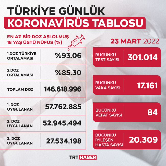 Buna göre, Türkiye'de son 24 saatte 301 bin 14 COVID-19 testi yapıldı, 17 bin 161 kişinin testi pozitif çıktı, 84 kişi hayatını kaybetti, iyileşenlerin sayısı ise 20 bin 309 oldu.
