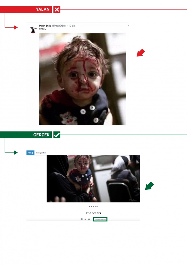 Örgüte yakın hesapların Afrin'de gibi paylaştığı yaralı çocuk görselinin de AFP tarafından 30 Ağustos 2016'da servis edildiği belirlendi.