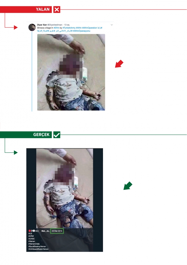 Sosyal medyada Afrin'de çocukların hedef alındığı yalanıyla paylaşılan görselin, Yemen'de Suudi Arabistan'ın hava saldırısında ölen bir çocuğa ait olduğu tespit edildi.
