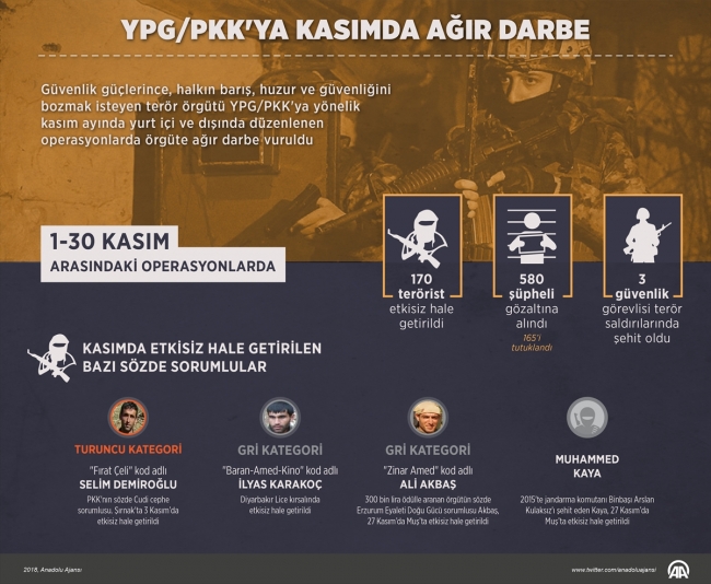 Yıl boyunca gece gündüz demeden şehir merkezi ve kırsal alanların yanı sıra yurt dışında da teröristlerin peşini bırakmayan, olumsuz hava koşullarına rağmen haftalarca arazide kalarak operasyonlarını sürdüren güvenlik güçleri, terör örgütü YPG/PKK'ya bu yılın kasım ayında da ağır darbe vurdu.