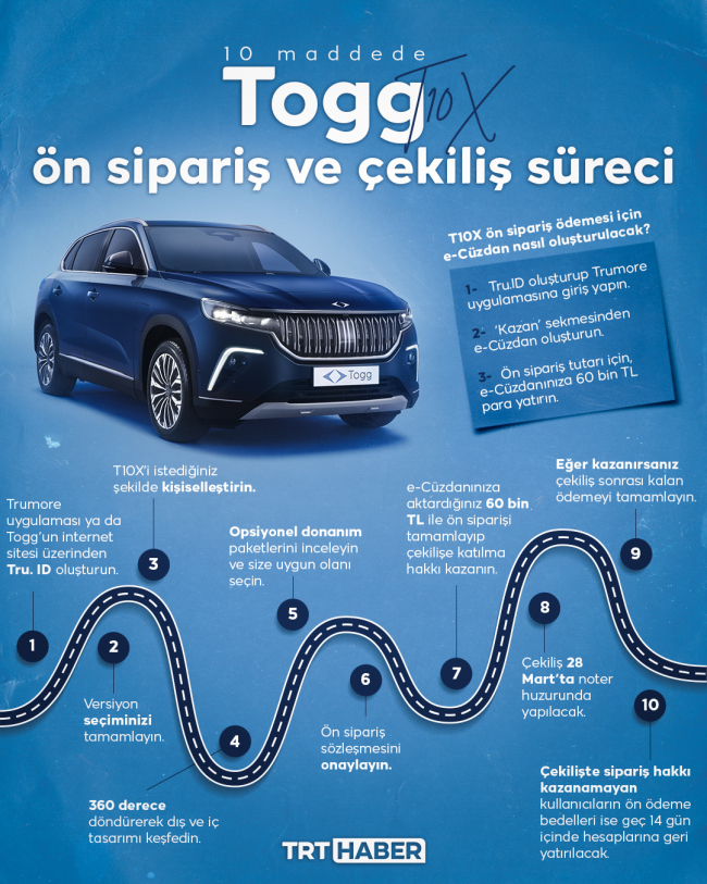 Ön sipariş ödemesi için e-Cüzdan nasıl oluşturulacak? Çekiliş sonucu kazanamayanların ön ödeme bedelleri ne zaman yatırılacak? İşte 10 maddede Togg T10X ön sipariş ve çekiliş süreci.