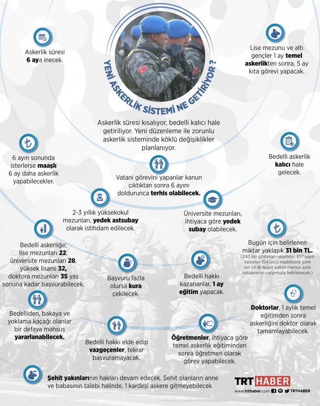 Askerlik süresi kısalıyor, bedelli kalıcı hale getiriliyor. Zorunlu askerlik sisteminde köklü değişiklikler planlanıyor. Yeni sistemle ilgili yasa teklifi artık Mecliste.