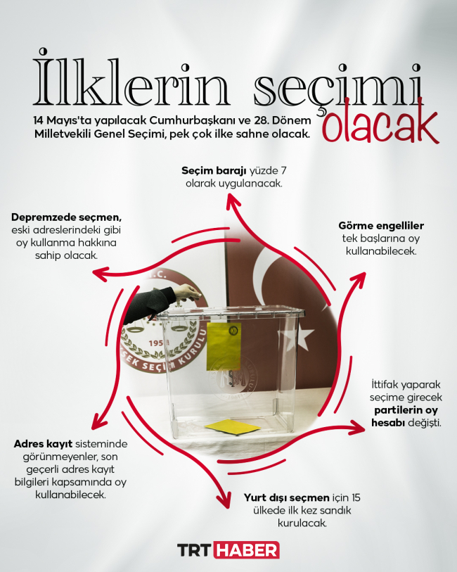 14 Mayıs'ta yapılacak Cumhurbaşkanı ve 28. Dönem Milletvekili Genel Seçimi, yüzde 10'dan yüzde 7'ye indirilen seçim barajının uygulanması, görme engellilerin hazırlanan şablonla tek başlarına oy kullanması gibi pek çok ilke sahne olacak.