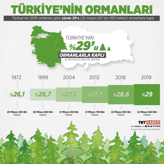 Türkiye topraklarının üçte biri ormanlık alanlardan oluşuyor. “Geleceğe Nefes” kampanyası sayesinde daha da yeşil olacak. Son 16 yılda yaklaşık 4 milyar 300 milyon fidan dikildi. 2023’e kadar bu sayının 7 milyara ulaşması bekleniyor.
