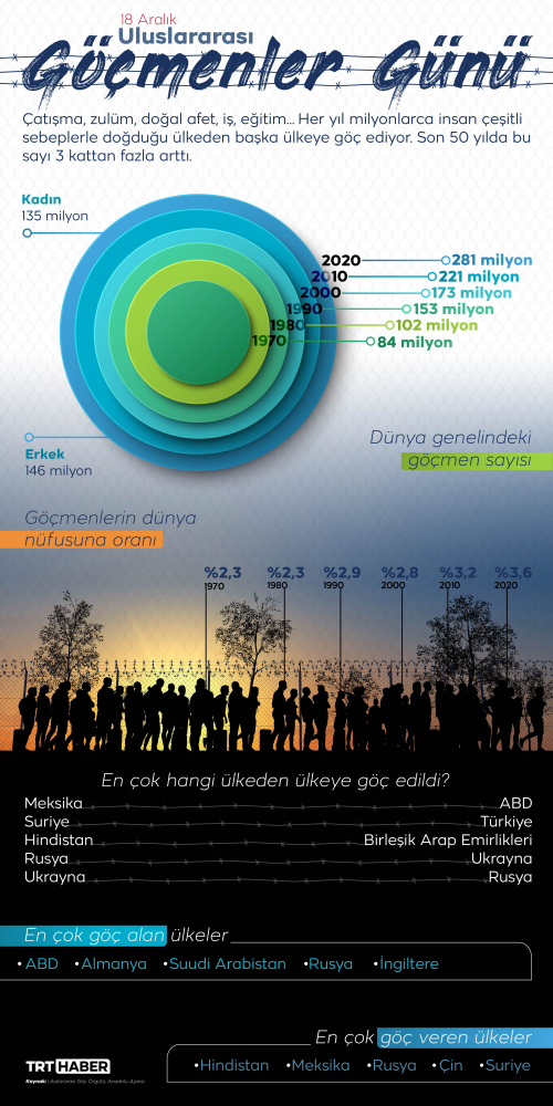 Bugün 18 Aralık Uluslararası Göçmenler Günü. Çeşitli sebeplerle ülkesinden ayrılanların sayısı her geçen yıl artıyor. Dünyadaki göçmen sayısı, en çok göç alan ve veren ülkeler ile Türkiye'nin göçmen politikaları haberimizde.