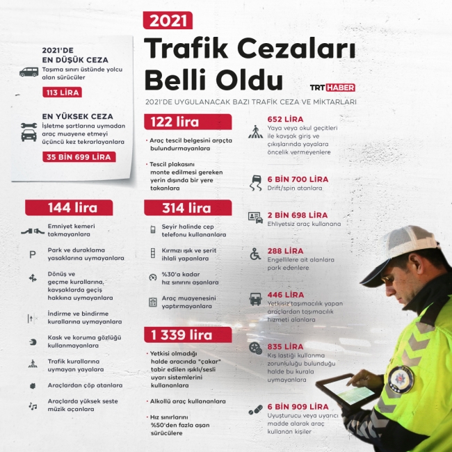 Yeni yılda trafik cezaları yüzde 9,11 arttı. En düşük ceza 113 lira oldu, en yüksek ceza ise 35 bin 699 liraya yükseldi.